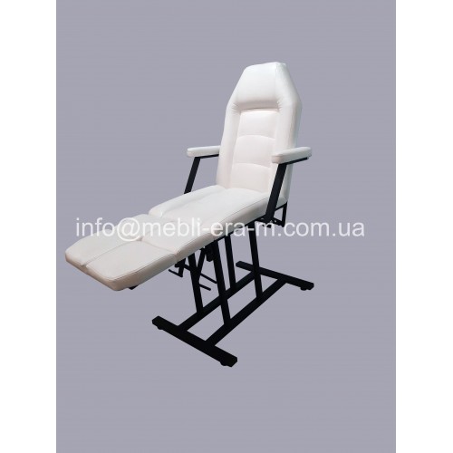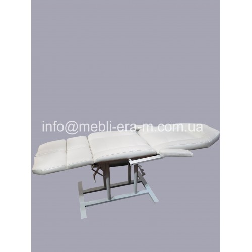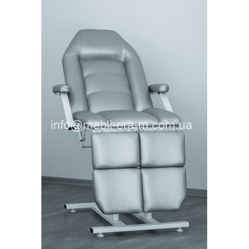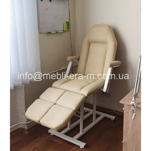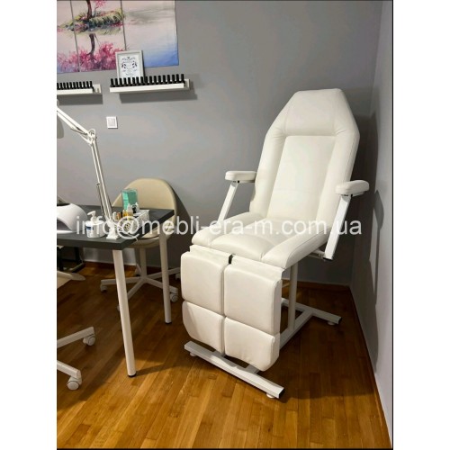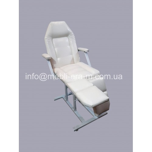 Трех – секционное педикюрно – косметологическое кресло с раздельными подножками , выдвижными подушками и съемными подлокотниками. Педикюрно - косметологическое кресло-кушетка раскладывается от положения «сидя» (спинка практически под углом 85º) до горизонтального положения «лежа», регулировка положений осуществляется механически. Подножная часть опускается вниз под 90 град..Основание кушетки (база) — качественная и прочная металлоконструкция, окрашенная порошковой краской белого цвета(под заказ черная)
